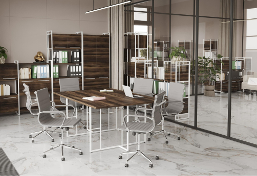 Минималистичный стиль лофт, дизайнерские опоры у столов руководителей, журнальных столов, столов для переговоров, металлические каркасы у стеллажей, наборные шкафы - все это современная серия Миллениум Директ.