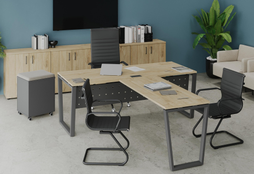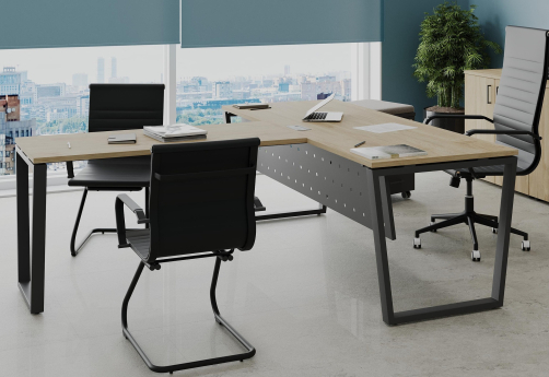 Рабочие столы для руководителя на металлических опорах в форме обратной трапеции, столы на опорных греденциях, столы переговоров оптимальных размеров, приставные элементы, удобные системы хранения в офисе – все это Сити Макси Директ.