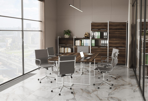 Минималистичный стиль лофт, дизайнерские опоры у столов руководителей, журнальных столов, столов для переговоров, металлические каркасы у стеллажей, наборные шкафы - все это современная серия Миллениум Директ.