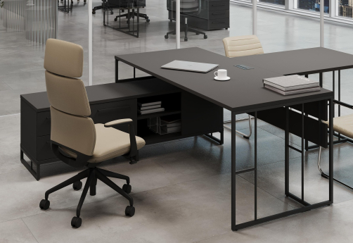 Минималистичный стиль лофт, дизайнерские опоры у столов руководителей, журнальных столов, столов для переговоров, металлические каркасы у стеллажей, наборные шкафы - все это современная серия Миллениум Директ.
