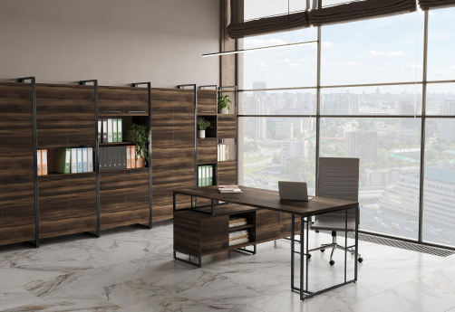 Минималистичный стиль лофт, дизайнерские опоры у столов руководителей, журнальных столов, столов для переговоров, металлические каркасы у стеллажей, наборные шкафы - все это современная серия Миллениум Директ.