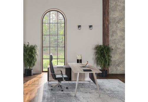 Элегантный премиальный дизайн отечественного кабинета Кронберг выполнен в современном стиле и подчеркивает высокое качество материалов. Металлические опоры сложной формы, эффект парящей столешницы, отсутствие лицевой фурнитуры - все это придает визуальную воздушность и легкость мебели для руководителя.
