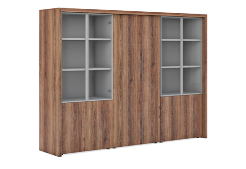 Мебель для кабинета руководителя премиум-класса - монолитные столешницы, геометрия линий, цвета материалов под натуральное дерево, отделка качественной экокожей, шкаф-тотем со светодиодной подсветкой, встроенные кабель-каналы, механизм push-to-open.