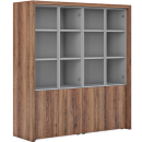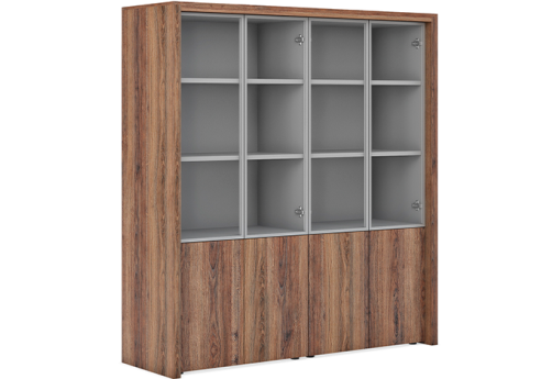 Мебель для кабинета руководителя премиум-класса - монолитные столешницы, геометрия линий, цвета материалов под натуральное дерево, отделка качественной экокожей, шкаф-тотем со светодиодной подсветкой, встроенные кабель-каналы, механизм push-to-open.