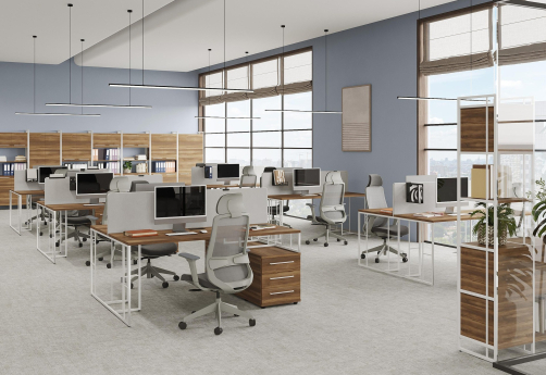 Минималистичный стиль лофт, дизайнерские опоры у столов, металлические каркасы у стеллажей, рабочие станции, наборные шкафы - все это современная серия Миллениум.