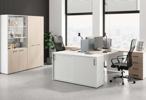 Для максимального комфорта в рабочем пространстве - серия Эволюция. Современный дизайн, высокое качество материалов, эргономичные решения, актуальная цветовая гамма. Столы на ЛДСП-каркасах с заглушками кабель-каналов, стеллажи на металлокаркасе, удобные шкафы и тумбы.