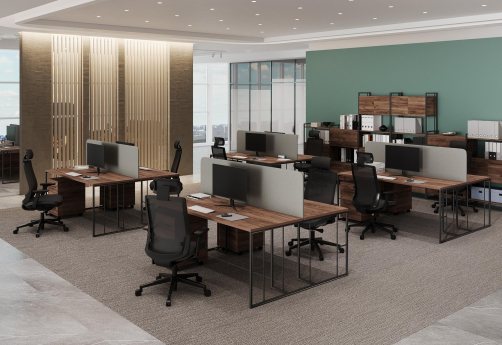 Минималистичный стиль лофт, дизайнерские опоры у столов, металлические каркасы у стеллажей, рабочие станции, наборные шкафы - все это современная серия Миллениум.