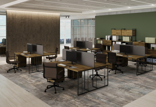 Минималистичный стиль лофт, дизайнерские опоры у столов, металлические каркасы у стеллажей, рабочие станции, наборные шкафы - все это современная серия Миллениум.
