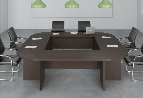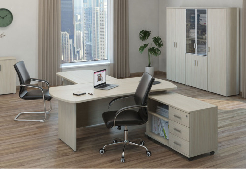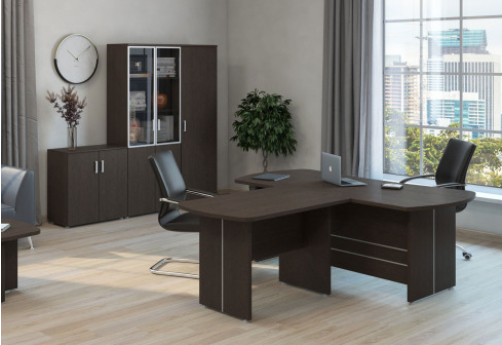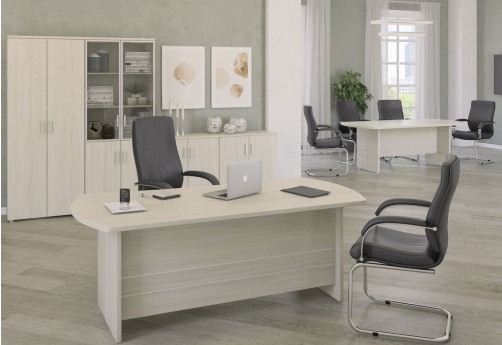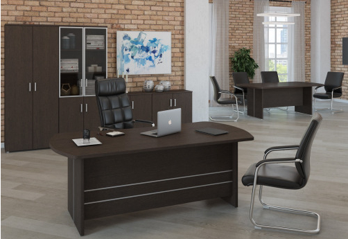 Изящная мебель для руководителя серии Дюшес - столы с с толстой столешницей и декоративными молдингами без прямых углов, модульные столы для переговоров, шкафы и тумбы в едином стиле.