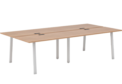 Изюминка серии - столы и бенчи на металлических опорах А-образной формы, обтянутые износостойкой пленкой в текстуре светлого дерева. А также минималистичный дизайн, большая линейка мебели для хранения, тканевые экраны, столешница с скосом.