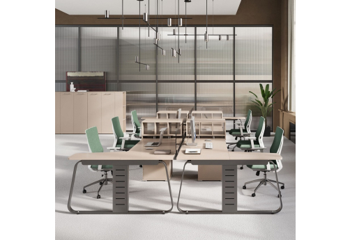 Для современного офиса - актуальная линейка мебели Валетта. Особенность коллекции - металлические матовые опоры серого цвета, со встроенными кабель-каналами и столешницы со скругленными углами.