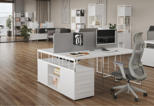 Минималистичный стиль лофт, дизайнерские опоры у столов, металлические каркасы у стеллажей, рабочие станции, наборные шкафы - все это современная серия Миллениум.