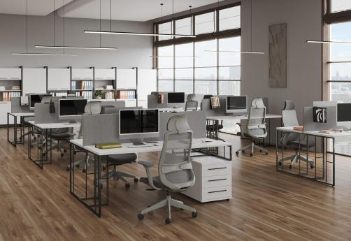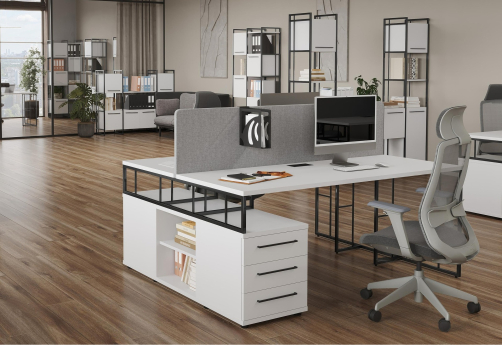 Минималистичный стиль лофт, дизайнерские опоры у столов, металлические каркасы у стеллажей, рабочие станции, наборные шкафы - все это современная серия Миллениум.