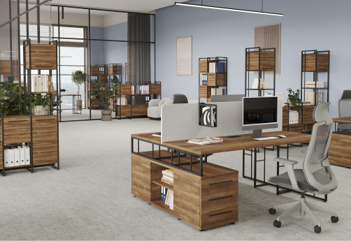 Минималистичный стиль лофт, дизайнерские опоры у столов, металлические каркасы у стеллажей, рабочие станции, наборные шкафы - все это современная серия Миллениум.
