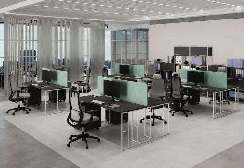 Минималистичный стиль лофт, дизайнерские опоры у столов, металлические каркасы у стеллажей, рабочие станции, наборные шкафы - все это современная серия Миллениум.