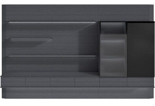 Премиальная мебель для руководителя. Изготовлен из шпона натурального дуба с матовым покрытием, с антрацитовым отливом и нулевым глянцем. Оригинальные металлические хромированные опоры. Шкаф с консольными полками с подсветкой и ящиками.