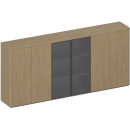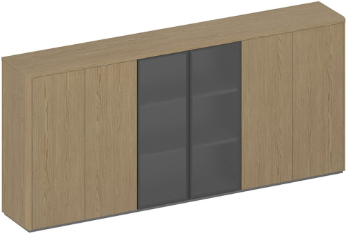 Особенности шкафов - комбинация древесного декора шпона, эмали и ЛДСП темно-серого цвета, а также металлических рамок из черного матового профиля стеклянных дверей. Стеклянные дверцы с интегрированной алюминиевой ручкой на вертикальной планке. У распашных деревянных дверей нет выступающих ручек, так как используется система «push to open».