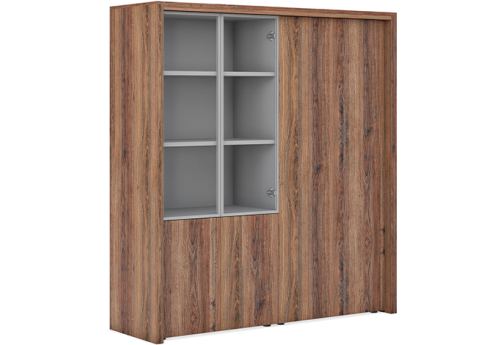 Мебель для кабинета руководителя премиум-класса - монолитные столешницы, геометрия линий, цвета материалов под натуральное дерево, отделка качественной экокожей, шкаф-тотем со светодиодной подсветкой, встроенные кабель-каналы, механизм push-to-open.