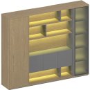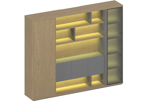 Светодиодная подсветка полок в открытой секции и за стеклянной дверью узкой секции шкафа, включение подсветки сенсорное, осуществляется касанием руки. В открытой секции шкафа для дверей толщиной 16 мм и декоративных боковых стенок толщиной 30 мм используется плита МДФ, окрашенная со всех сторон матовой эмалью цвета антрацит, кромка из шпона толщиной 0,5 мм с лакокрасочным покрытием.