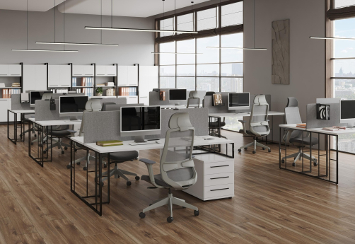 Минималистичный стиль лофт, дизайнерские опоры у столов, металлические каркасы у стеллажей, рабочие станции, наборные шкафы - все это современная серия Миллениум.
