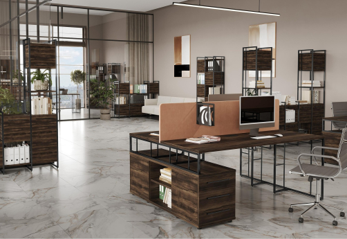 Минималистичный стиль лофт, дизайнерские опоры у столов, металлические каркасы у стеллажей, рабочие станции, наборные шкафы - все это современная серия Миллениум.