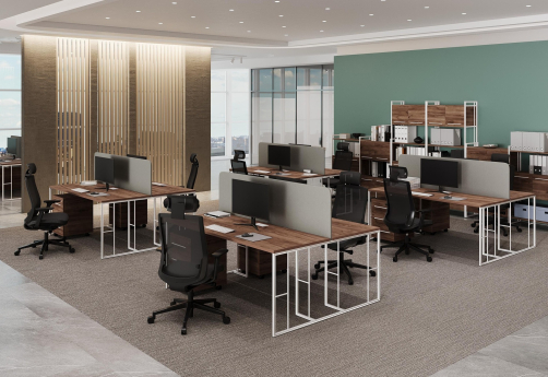 Минималистичный стиль лофт, дизайнерские опоры у столов, металлические каркасы у стеллажей, рабочие станции, наборные шкафы - все это современная серия Миллениум.