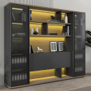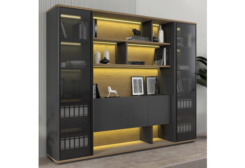 Светодиодная подсветка полок в открытой секции и за стеклянной дверью узкой секции шкафа, включение подсветки сенсорное, осуществляется касанием руки. В открытой секции шкафа для дверей толщиной 16 мм и декоративных боковых стенок толщиной 30 мм используется плита МДФ, окрашенная со всех сторон матовой эмалью цвета антрацит, кромка из шпона толщиной 0,5 мм с лакокрасочным покрытием.