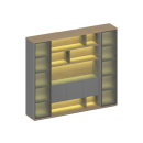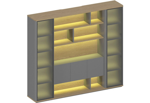 Светодиодная подсветка полок в открытой секции и за стеклянной дверью узкой секции шкафа, включение подсветки сенсорное, осуществляется касанием руки. В открытой секции шкафа для дверей толщиной 16 мм и декоративных боковых стенок толщиной 30 мм используется плита МДФ, окрашенная со всех сторон матовой эмалью цвета антрацит, кромка из шпона толщиной 0,5 мм с лакокрасочным покрытием.
