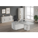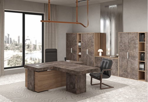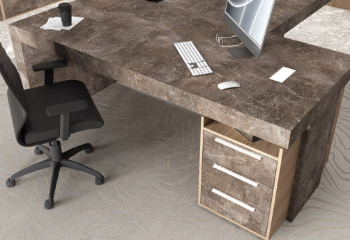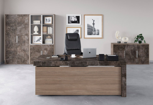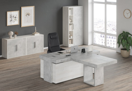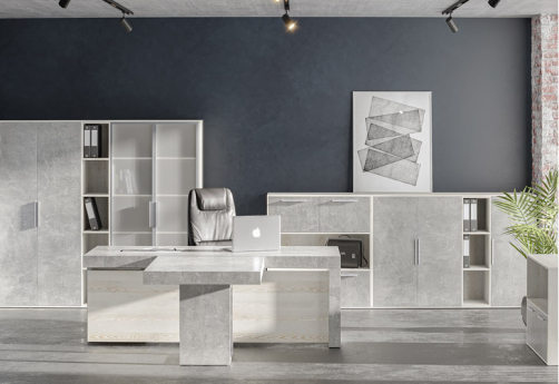 Кабинет руководителя Супер Т выполнен в современном стиле с использованием дополнительного декора - плиты в цвете "бетон светлый" и "бетон темный". Толстая столешница - 100 мм - со встроенными кабель-каналами.