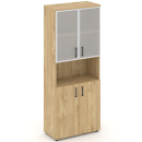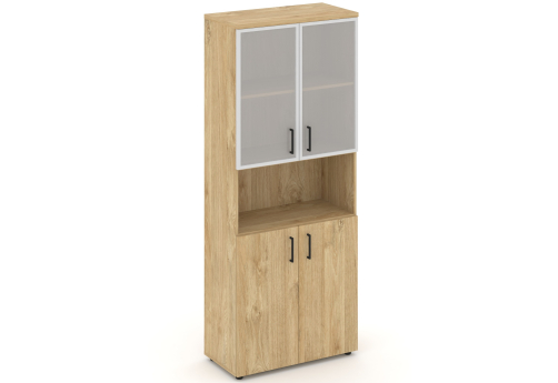 Шкаф высокий широкий (2 низких фасада ЛДСП + 2 низких фасада стекло сатин в раме) ЗС ЛХДФ Сити Офис Вуд, цвет тиквуд светлый
