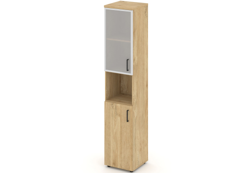 Шкаф высокий узкий левый (1 низкий фасад ЛДСП + 1 низкий фасад стекло сатин в раме) ЗС ЛХДФ Сити Офис Вуд, цвет тиквуд светлый