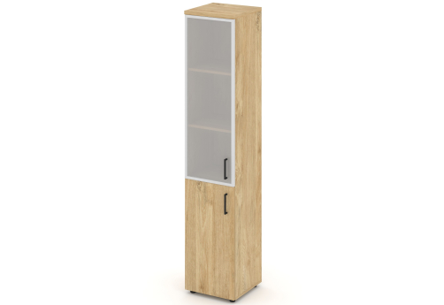Шкаф высокий узкий левый (1 низкий фасад ЛДСП + 1 средний фасад стекло сатин в раме) ЗС ЛХДФ Сити Офис Вуд, цвет тиквуд светлый