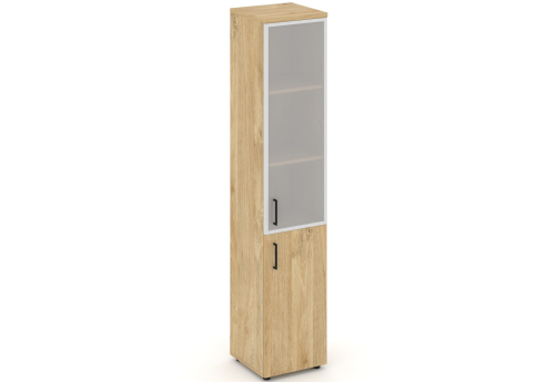 Шкаф высокий узкий правый (1 низкий фасад ЛДСП + 1 средний фасад стекло сатин в раме) ЗС ЛДСП Сити Офис Вуд, цвет тиквуд светлый