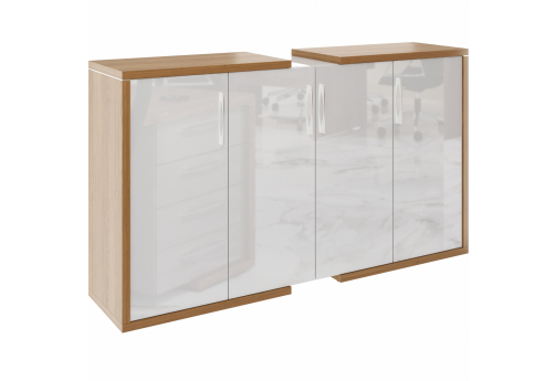 Современная качественная мебель для кабинета руководителя - столы с передними панелями из МДФ, с хромовыми декоративными проставками в цвет лицевой фурнитуры. Тумбы и шкафы с МДФ-фасадами.