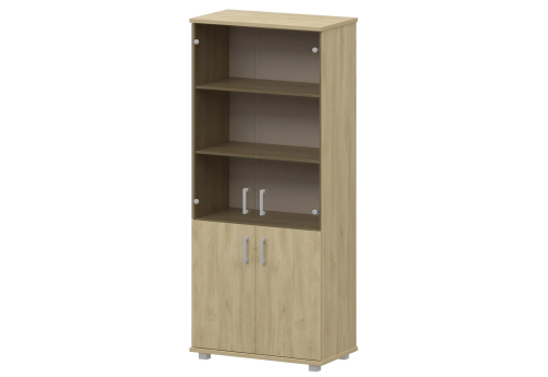 Стеллаж низкий узкий закрытый со стеклянным фасадом Сантана, цвет дуб сафари + серый