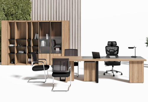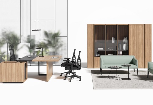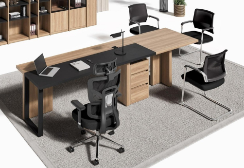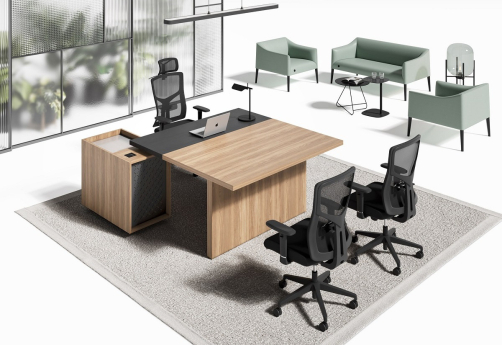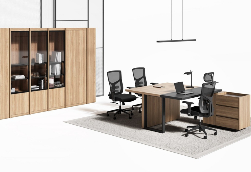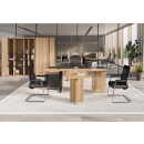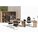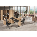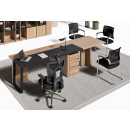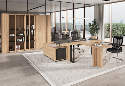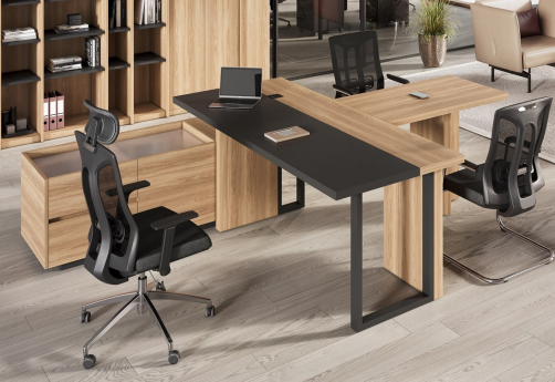 Серия Франклин Люкс – комфортная мебель в кабинет руководителя. Столы на дизайнерском металлокаркасе в актуальном цвете дуб в сочетании с антрацитом. Прямые линии, современный дизайн, элементы домашнего уютного кабинета.
