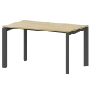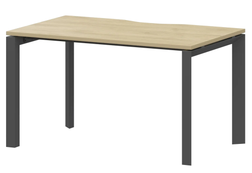 Прямые и эргономичные рабочие столы, бенчи на металлокаркасе П-образной формы. Фурнитура - матовые ручки и квадратные опоры на тумбах и шкафах. Фактура ЛДСП сделана по технологии тиснения «шпон».