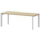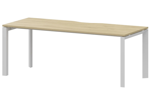 Прямые и эргономичные рабочие столы, бенчи на металлокаркасе П-образной формы. Фурнитура - матовые ручки и квадратные опоры на тумбах и шкафах. Фактура ЛДСП сделана по технологии тиснения «шпон».