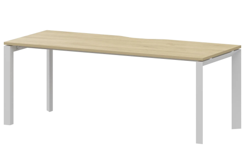 Прямые и эргономичные рабочие столы, бенчи на металлокаркасе П-образной формы. Фурнитура - матовые ручки и квадратные опоры на тумбах и шкафах. Фактура ЛДСП сделана по технологии тиснения «шпон».