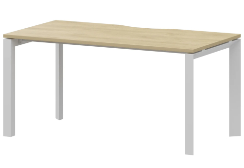 Прямые и эргономичные рабочие столы, бенчи на металлокаркасе П-образной формы. Фурнитура - матовые ручки и квадратные опоры на тумбах и шкафах. Фактура ЛДСП сделана по технологии тиснения «шпон».