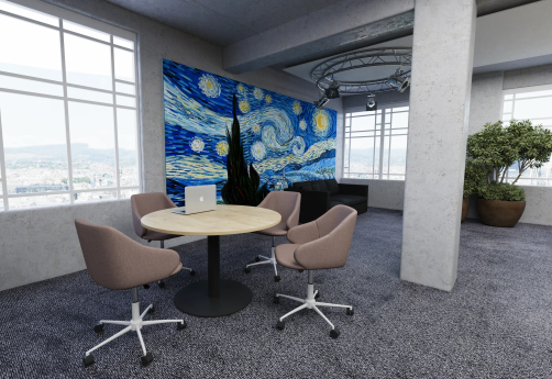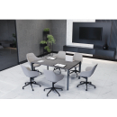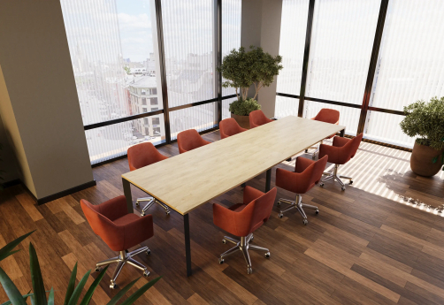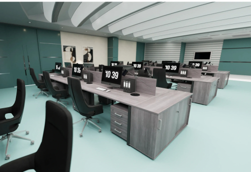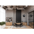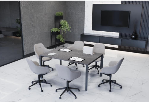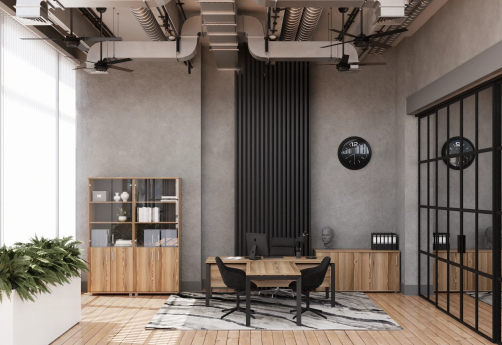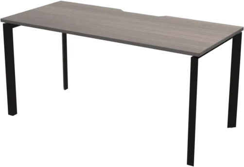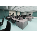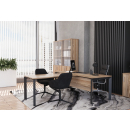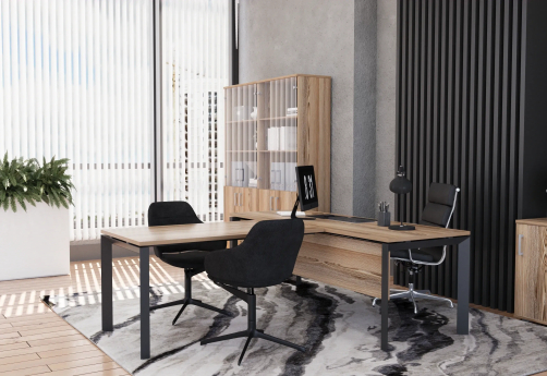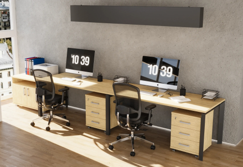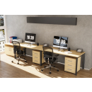 Прямые и эргономичные рабочие столы, бенчи на металлокаркасе П-образной формы. Фурнитура - матовые ручки и квадратные опоры на тумбах и шкафах. Фактура ЛДСП сделана по технологии тиснения «шпон».