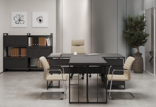 Минималистичный стиль лофт, дизайнерские опоры у столов руководителей, журнальных столов, столов для переговоров, металлические каркасы у стеллажей, наборные шкафы - все это современная серия Миллениум Директ.