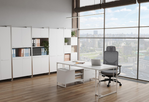 Минималистичный стиль лофт, дизайнерские опоры у столов руководителей, журнальных столов, столов для переговоров, металлические каркасы у стеллажей, наборные шкафы - все это современная серия Миллениум Директ.