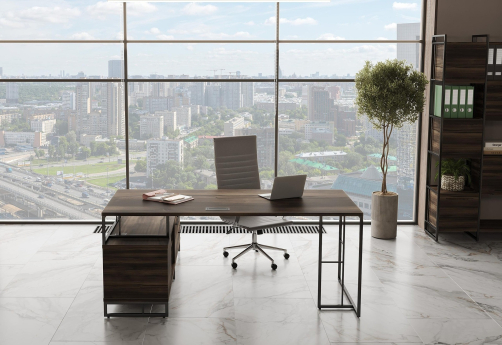 Минималистичный стиль лофт, дизайнерские опоры у столов руководителей, журнальных столов, столов для переговоров, металлические каркасы у стеллажей, наборные шкафы - все это современная серия Миллениум Директ.