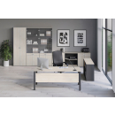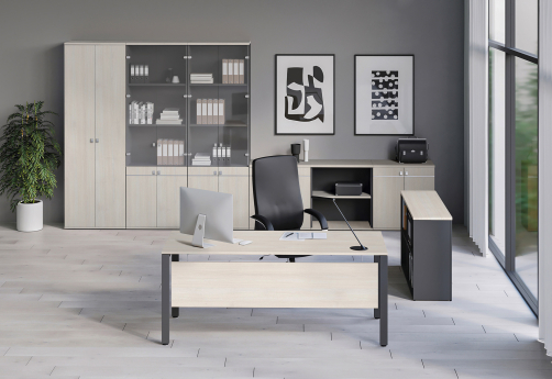 Кабинет Эрника поможет создать комфортное рабочее место для руководителя в легком, но строгом дизайне. Столы на металле, а также на опорных тумбах. Каркасы шкафов и металлоопоры столов в белом цвете. Возможно окрашивание опор в любой цвет по RAL.