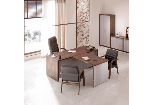 Современная качественная мебель для кабинета руководителя, выполненная из ЛДСП, МДФ с покрытием ламинатом и эмалью. Модельный ряд позволяет полностью укомплектовать рабочее место руководителю, а также переговорную комнату.