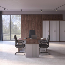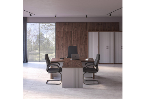 Современная качественная мебель для кабинета руководителя, выполненная из ЛДСП, МДФ с покрытием ламинатом и эмалью. Модельный ряд позволяет полностью укомплектовать рабочее место руководителю, а также переговорную комнату.
