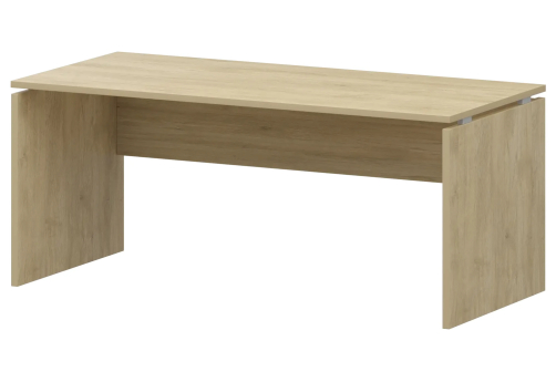 Классический дизайн, столы с «парящей» столешницей, с алюминиевыми проставками. Фурнитура - матовые ручки и квадратные опоры на тумбах и шкафах. Фактура ЛДСП сделана по технологии тиснения «шпон».