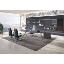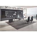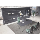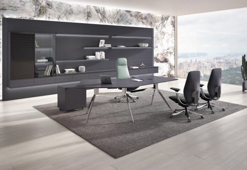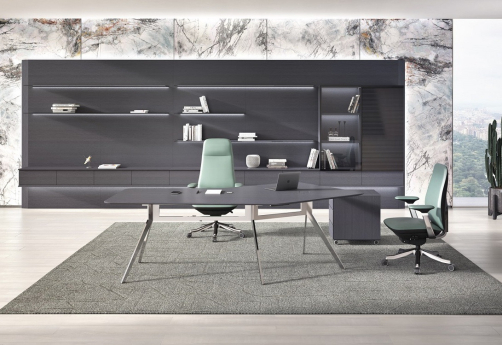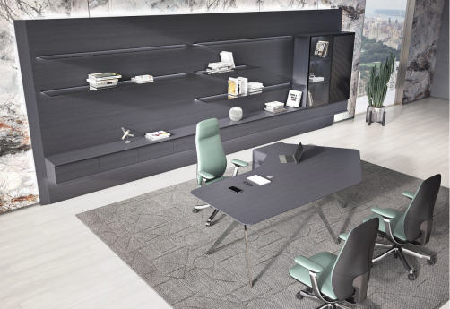 Премиальная мебель для руководителя. Изготовлен из шпона натурального дуба с матовым покрытием, с антрацитовым отливом и нулевым глянцем. Оригинальные металлические хромированные опоры. Шкаф с консольными полками с подсветкой и ящиками.