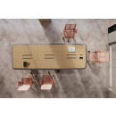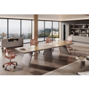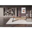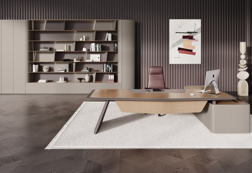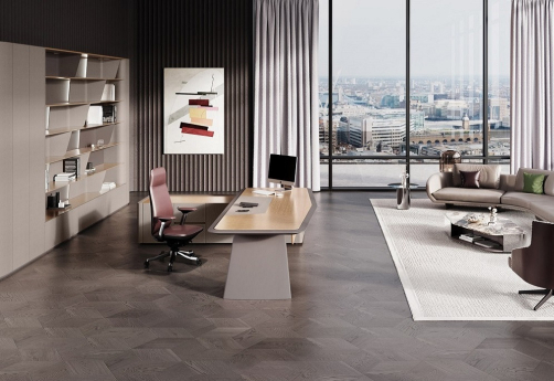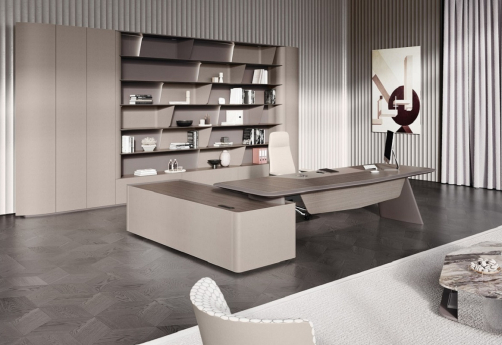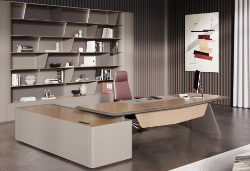 Элитная мебель в кабинет руководителя. Столешницы со сложной кромкой с обратным скосом. Благородные цвета, высококачественные материалы. Тумбы с коммуникационными блоками, шкафы с подсветкой.